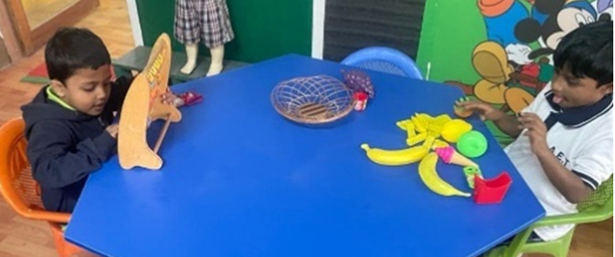 UKG is reinforcement of all that was introduced in Pre-KG along with a formal introduction to alphabet sounds and numbers through tracing using teaching modules. Tracing is important because children are still very sensitive to touch till about 3.5 to 4 years of age. The rhymes and stories at circle time, Object talk and riddles make them vocabulary-rich and bring about confidence and social interaction skills in children. Further, the emphasis on sensorial, open-ended material play, movement and outdoor play continues.